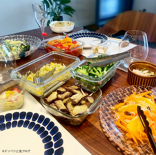 人を招いて開いた“おうち泡会”の日の前菜テーブル。野菜メインのマリネで軽めにスタート。人を呼ぶときは、少し頑張ります。(笑)
